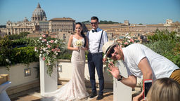 A wedding in Italy for two, on one of our top venues with a panoramic view of the Vatican - this venue was chosen by Vlada and Eugene. As a result, 10 more guests came to the wedding and it turned out to be a real cheerful atmospheric holiday. Ourwedding photographer in Rome captured the live emotions of all the guests and made a stylish wedding photo shoot on the most beautiful streets of the Vatican.
