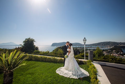 Summer wedding withbreathtaking panoramic viewto the Gulf of Naples. The wedding took place in a luxurious villa, with numerous guests who came from all over Italy and America. The villa where the wedding took place is also a 5-star hotel, with its own restaurant andstar chef. Everything was according to European traditions: a wedding ceremony with a panoramic view, an aperitif with a variety of snacks on the terrace and a wedding dinner in a restaurant with large windows, from where all the guests watchedamazing sunset.